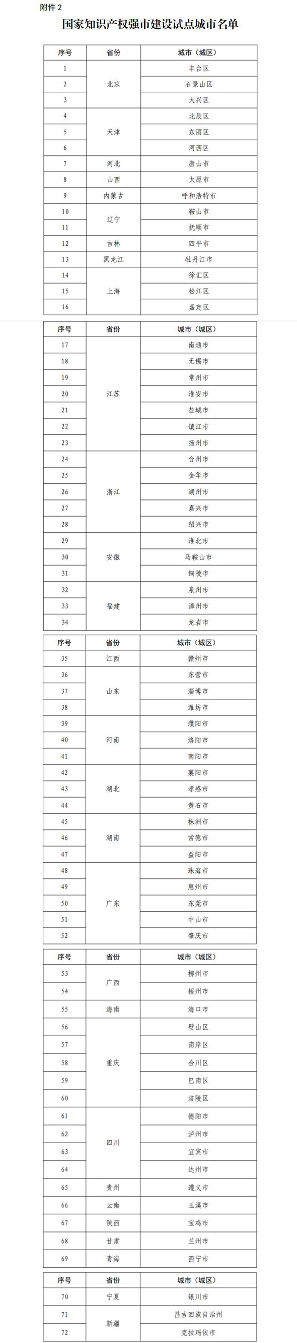按照《国家知识产权局办公室关于面向城市、县域、园区开展知识产权强国建设试点示范工作的通知》(国知办函运字〔2021〕1197号)要求,经地方申报推荐、材料审查、专家评审等程序,确定北京市海淀区等38个城市(城区)为国家知识产权强市建设示范城市(名单见附件1),北京市丰台区等72个城市(城区)为国家知识产权强市建设试点城市(名单见附件2),试点示范时限自2022年7月至2025年6月。