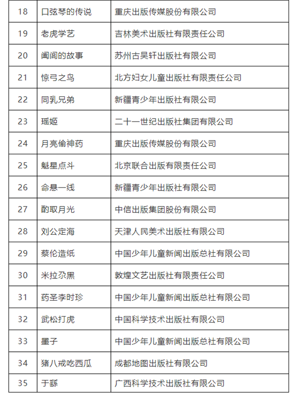 为推动中国经典民间故事动漫创作出版,国家新闻出版署2022年5月印发了《关于开展中国经典民间故事动漫创作出版工程(第四辑)申报工作的通知》。经出版单位申报、组织专家评审等程序,现拟确定中国美术学院出版社《梁山伯与祝英台》等35个民间故事动漫创作出版项目入选。现将有关名单进行公示。