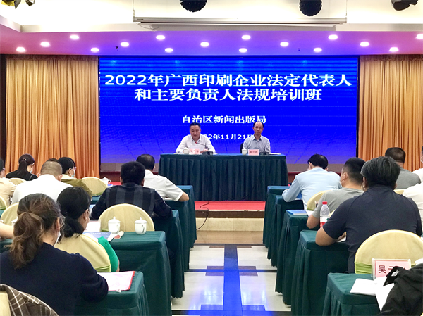 11月21日至22日,自治区新闻出版局在南宁成功举办2022年全区印刷企业法定代表人和主要负责人法规培训班。自治区党委宣传部副部长、自治区新闻出版局(版权局)局长,一级巡视员王晓华出席开班仪式并作开班动员讲话,对印刷企业的发展提出了五个方面要求:一是要强化阵地意识,维护印刷领域文化安全;二是要强化市场意识,用好政策、资源等优势,努力做大做强印刷企业;三是要强化绿色意识,推动印刷企业实现绿色化发展;四是要强化质量意识,不断提升印制质量;五是要强化创新意识,激发企业发展新动能。