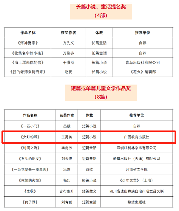 近日,第五届张天翼儿童文学奖评选结果揭晓,广西教育出版社选送的王勇英原创儿童文学作品《火灯钓蜂》荣获短篇或单篇儿童文学作品奖。