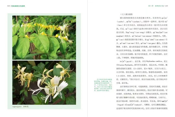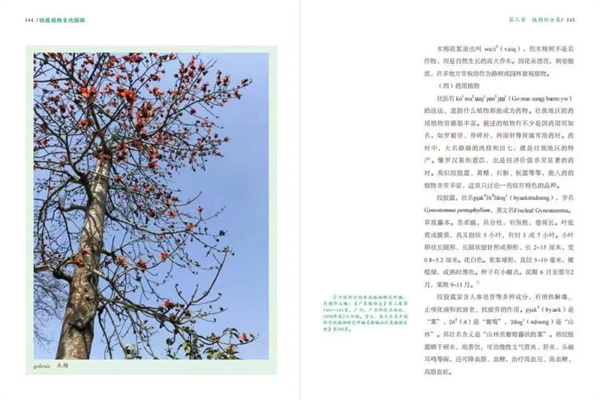 该书装帧风格别具特色,裸脊设计,整本书直立展开时,仿如一本日历,记录着壮族人民如何认识和运用植物的岁月。封面以一朵极具广西特色的金花茶作为镂空叠加工艺的主角,层叠开放。内页使用超感纸印刷,真实还原了植物的特点,叶脉纹络,都栩栩如生、活灵活现跃然纸上,色泽分明,质感丰富,读起来丝毫没有沉闷感。(广西民族报 记者 黄浩云)