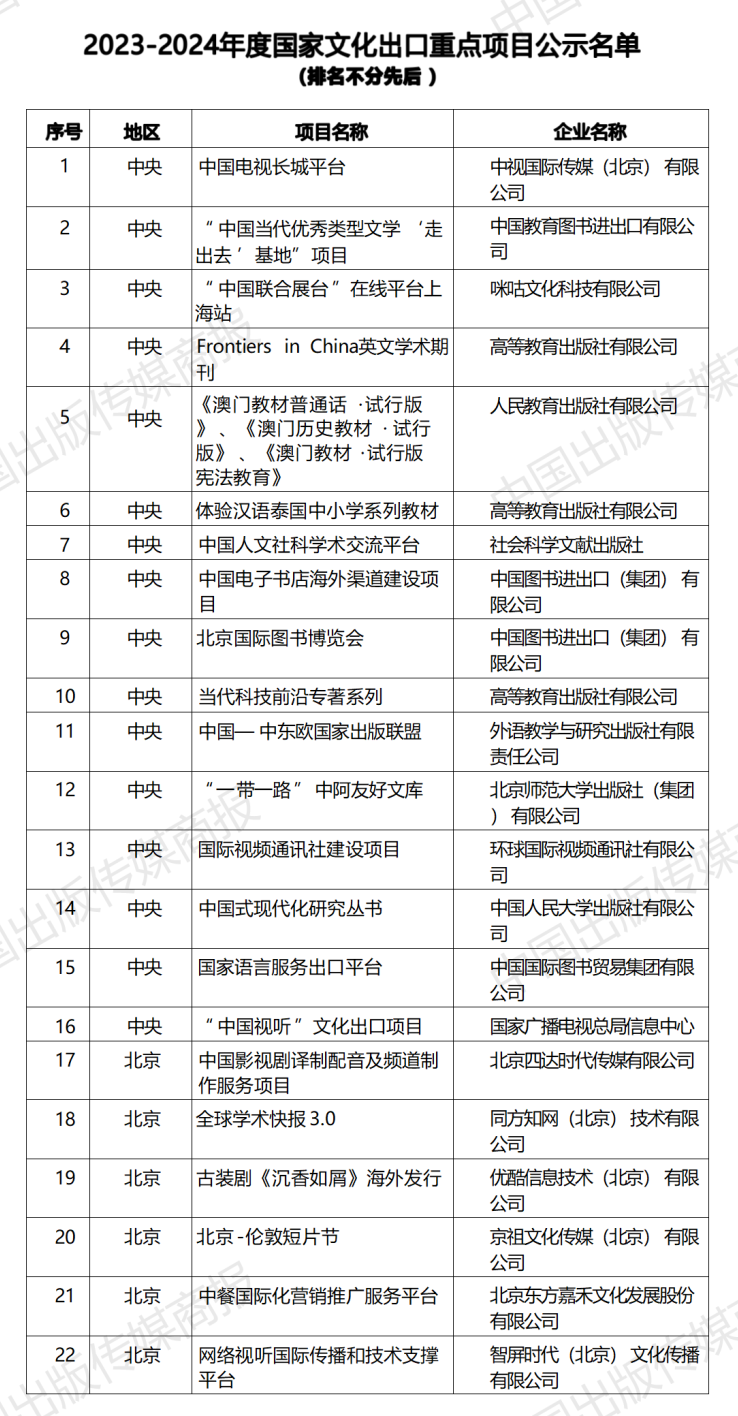 关于公示2023-2024年度国家文化出口重点企业和重点项目名单的通知