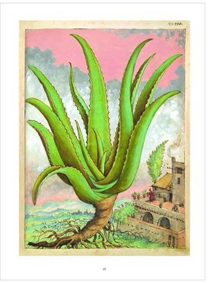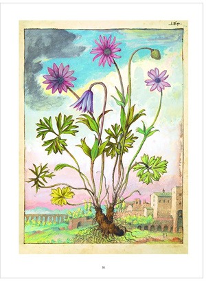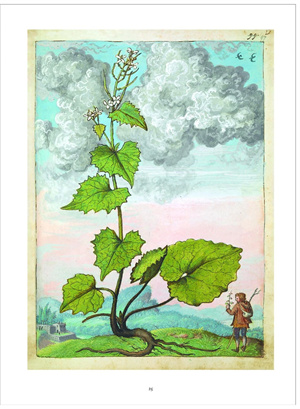 这些别具一格的植物画作被收录于16世纪马蒂奥利编写的《〈药物论〉评注》中,该书现藏于大英博物馆图书馆内。齐波运用超现实主义手法,将植物呈现于画面前景,被放大比例的植物根、茎、叶纤毫毕现,精美写实。背景的田园牧歌式风光以及人物的采摘剪影,既展现了植物的自然生境,又融合了齐波丰沛的想象力,极富浪漫主义色彩。