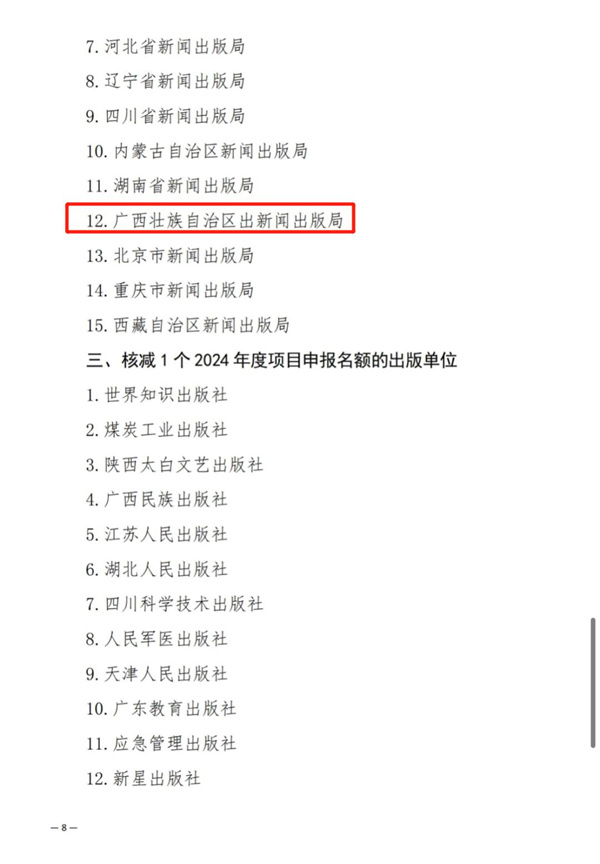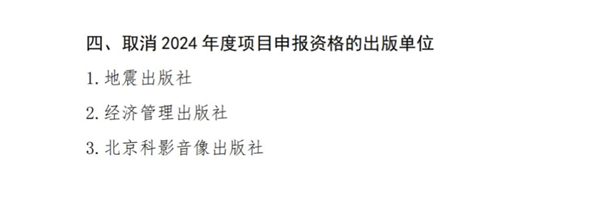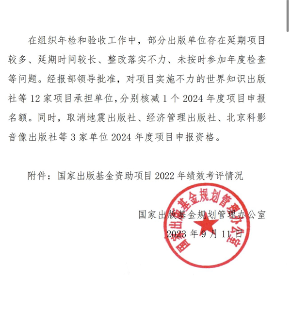 在组织年检和验收工作中,部分出版单位存在延期项目较多、延期时间较长、整改落实不力、未按时参加年度检查等问题。经报部领导批准,对项目实施不力的世界知识出版社等12家项目承担单位,分别核减1个2024年度项目申报名额。同时,取消地震出版社、经济管理出版社、北京科影音像出版社等3家单位2024年度项目申报资格。