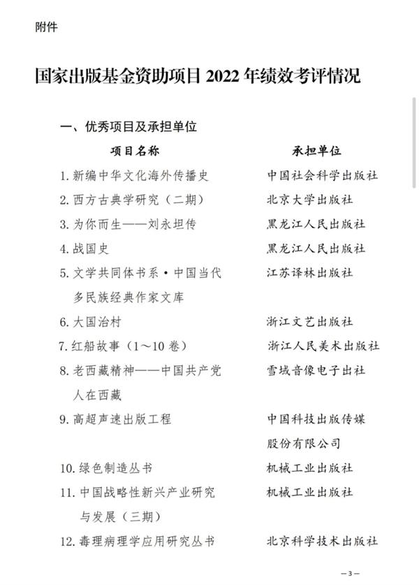 对《新编中华文化海外传播史》等65个项目的61家承担单位 (联合承担项目为主承担单位) 予以表扬,分别给予增加1~2个2024年度国家出版基金申报项目名额的奖励。对履职优秀的湖北省新闻出版局等15个省级出版行政管理部门予以表扬。