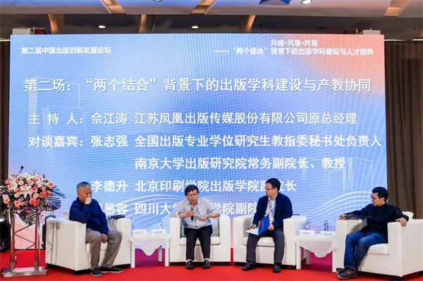 第二场对谈中,全国出版专业学位研究生教指委秘书处负责人、南京大学出版研究院常务副院长张志强,北京印刷学院出版学院副院长李德升,四川大学出版学院副院长胡易容,就“两个结合”背景下的出版学科建设与产教协同,围绕出版学科建设长效机制和产教协同,筑牢学术根基和实践根基,展开深入讨论和交流。他们提到,新时代出版学科需要培养更高层次、多元化、灵活化的专业人才,这既需要产学研密切合作,以行业检验学科建设和人才培养成果,又需要提振出版人才的信心,提升学科认同感和职业期待感。