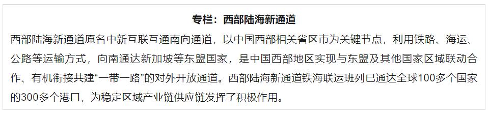 以中国西南山城重庆为运营中心的西部陆海新通道为国际产品进入中国市场开辟了新捷径。以前,老挝的商品运到重庆、四川等西部内陆腹地,至少需要20多天。如今货物搭乘西部陆海新通道的中老班列,从老挝到重庆只需4天。