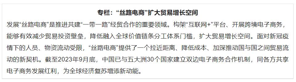 缔结贸易协定和扩大市场准入能够有效提振贸易。共建“一带一路”通过创新贸易方式、搭建贸易平台,打通贸易堵点,激活共建国家贸易潜能,为全球贸易大环流注入新动力。这些努力包括:打造以中国国际进口博览会为引领的矩阵式商品展会,同世界共享中国市场机遇;签署或升级自由贸易协定,共同建设自由贸易区网络;推动跨境电商发展,为拓展贸易增长空间提供新可能;深化海关贸易安全和通关便利化合作,提升贸易便利化水平。[13]