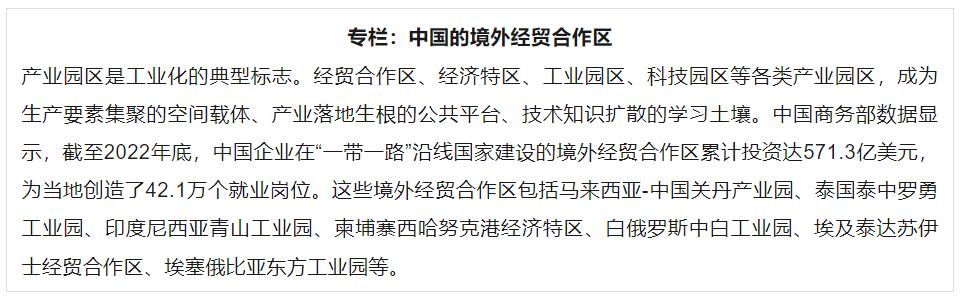 共建“一带一路”国家的产业合作,推动并强化了这一趋势。中泰新丝路塔吉克斯坦农业纺织产业园,帮助当地从棉花种植向棉纺织全产业链跨越。印度尼西亚摩洛哇丽县的青山工业园区,将曾经偏僻的小渔村变成了全球重要的镍矿开采冶炼和不锈钢产业基地,助力印尼“从卖30美元/吨镍原矿到卖2300美元/吨不锈钢”。在埃及泰达苏伊士经贸合作区,巨石玻璃纤维公司建成年产20万吨玻璃纤维生产线,令埃及成为全球第四大玻纤生产和贸易国,吸引大量上下游企业赴埃投资。