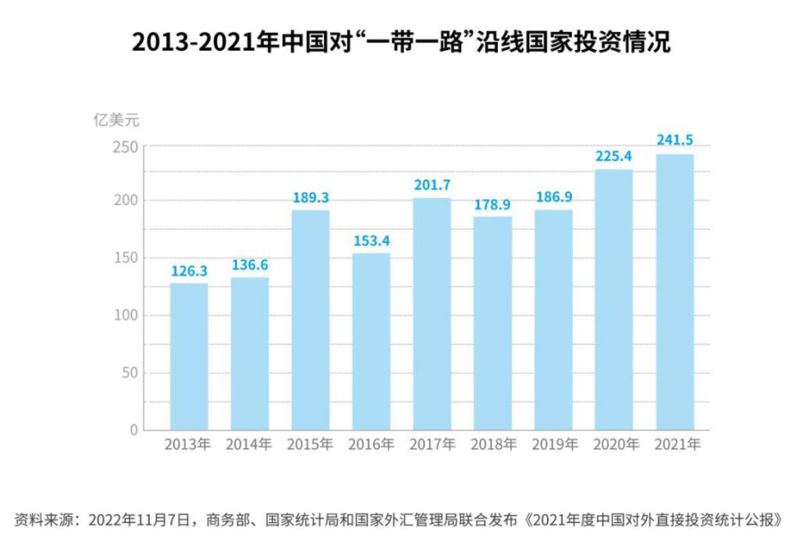 截至2021年底,中国在“一带一路”沿线国家设立企业超过1.1万家,约占中国境外企业总量的1/4。2021年,对“一带一路”沿线国家直接投资241.5亿美元,创历史新高,占中国全年对外投资流量总额的13.5%;年末存量2138.4亿美元,占存量总额的7.7%。[16]