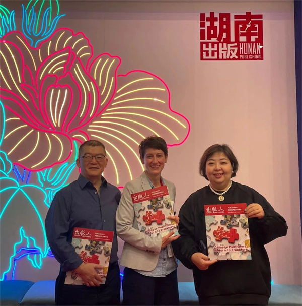 (从右至左:出版人杂志社社长白静、法兰克福书展官方媒体《Publishing Perspectives》社长哈娜·约翰逊、出版人杂志社副总编杨贵山)