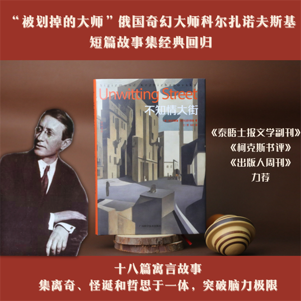 今年同样由广西科学技术出版社推出的第五本科尔扎诺夫斯基作品——《不知情大街》延续了其一贯的短篇小说风格,由十八篇哲学和幻想故事组成,以极其讽刺的目光审视了历史、上帝、哲学以及作家的命运,但与《骷髅自传》和《未来记忆》中硬密黑暗的故事相比,《不知情大街》无疑轻松了许多,正如《出版人周刊》所评价的,“科尔扎诺夫斯基的描述巧妙而讽刺,他最出色之处是在沉重的启示中找出一丝轻快”。