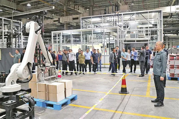 印刷车间智能机械手快速码垛引与会代表“围观”。