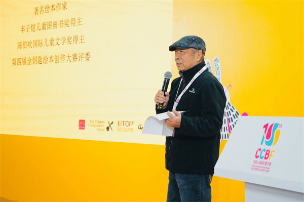 资深绘本作家朱成梁先生作为评委代表,分享了他在评审过程中的感受。他观察到,本届大赛投稿的作者多为女生,她们中多数人的文本和画面都非常细腻感人。此外,他还发现本届参赛作品多为绘本作者自己写故事自己画,彰显了年轻人独立自主的创作能力;另外,本届投稿作品题材丰富,风格多样,表现手法也各显神通。许多投稿作品都达到了出版水准,制作精良,这也预示着绘本事业未来的大好前景。