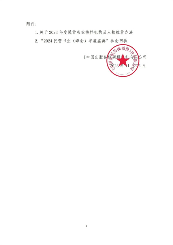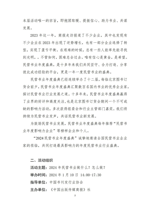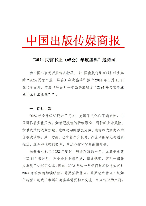 由中国书刊发行业协会指导、《中国出版传媒商报》社主办的“2024民营书业(峰会)年度盛典”拟于2024年1月10日在北京召开。本届(峰会)年度盛典主题为“2024年民营书业做什么?怎么做?”。