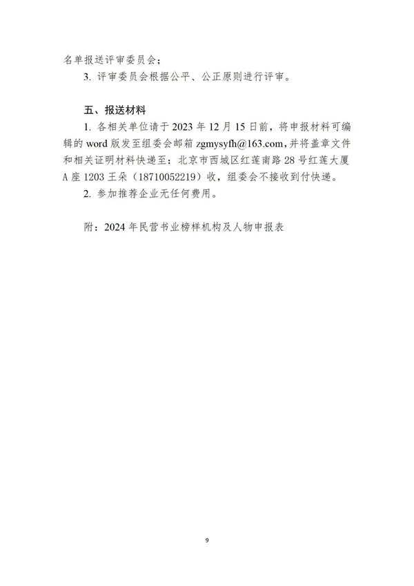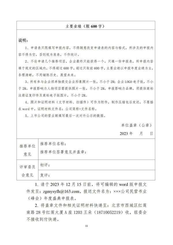 2.参加推荐的企业请于2023年12月15日前,将申报表的电子版发送至邮箱zgmysyfh@163.com。盖章的纸质材料快递至组委会,组委会不接收到付快递,参加奖项评选无任何费用。