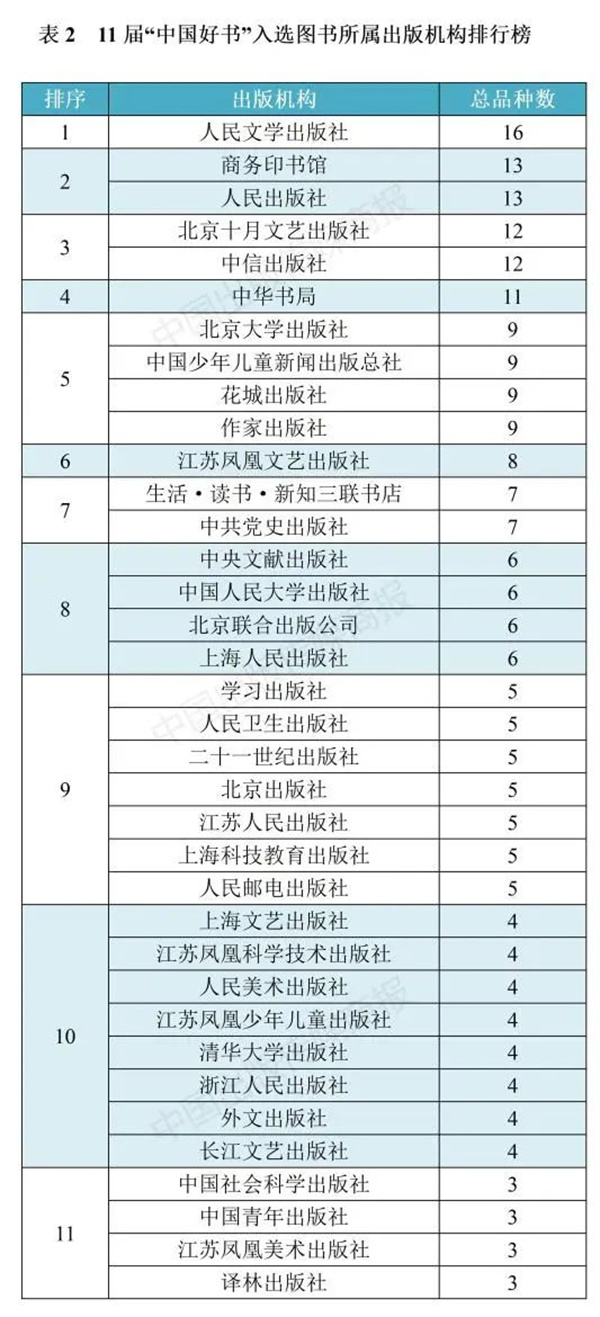从出版机构入选排行榜来看(见表2),11届“中国好书”出版机构入选品种数最多的是人民文学出版社,该社有2种图书《星空与半棵树》《奔跑的中国草》入选2023年度“中国好书”,至今共16种图书入选。商务印书馆和人民出版社今年各有1种图书入选,均以13种并列第2名。北京十月文艺出版社与中信出版社均以12种并列第3名。紧随其后的是中华书局11种图书入选,北京大学出版社、中国少年儿童新闻出版总社、花城出版社、作家出版社各有9种图书入选。其中作家社在2018年度评选中表现优异,有3种图书同时入选。