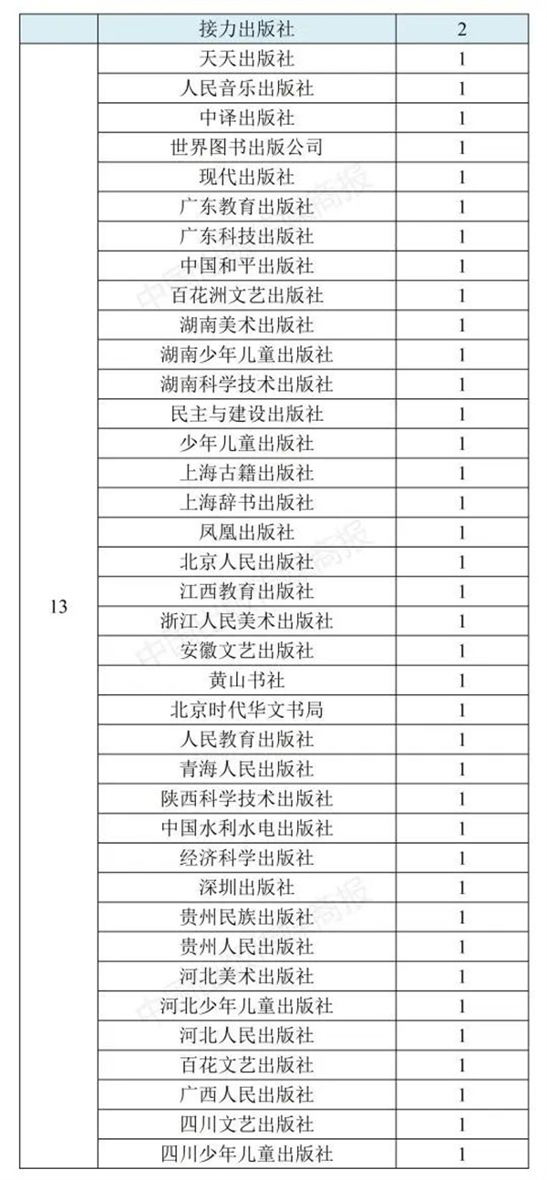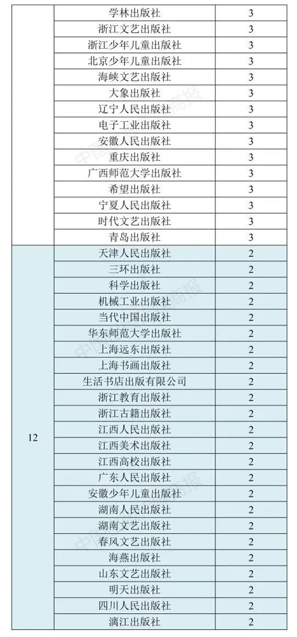 最新公布的2023年度“中国好书”,共涉及45家出版机构,其中人民文学出版社、北京联合出版公司、三环出版社各有2种图书入选。这45家出版机构中,有14家是新面孔,首次有图书获得这一荣誉。分别是:中国妇女出版社、北京人民出版社、经济科学出版社、贵州民族出版社、福建教育出版社、青海人民出版社、深圳出版社、江西教育出版社、三环出版社、广东科技出版社、文汇出版社、中国和平出版社、人民教育出版社、贵州人民出版社。其中,三环出版社今年凭借《课文背后的红色故事》《我的城,我的镇——景漂的故事》2种入选图书居于另外13家出版机构前列。