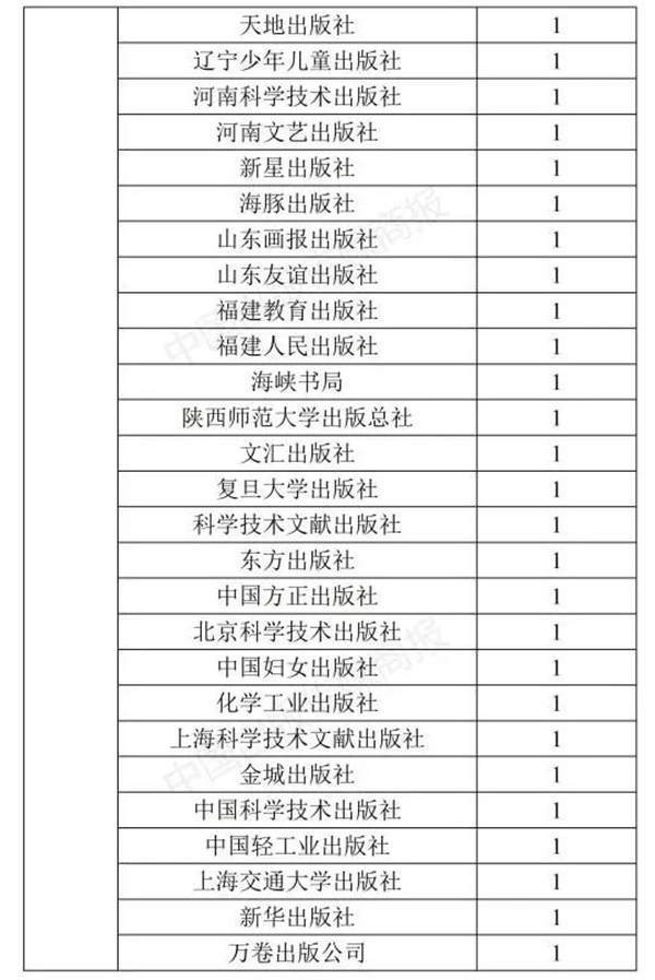 北京出版集团位列第四位,有21种入选图书。该集团旗下的北京十月文艺出版社凭借12种文学艺术类入选图书的优势,高于北京出版社、北京少年儿童出版社、北京人民出版社3家的总入选品种数。