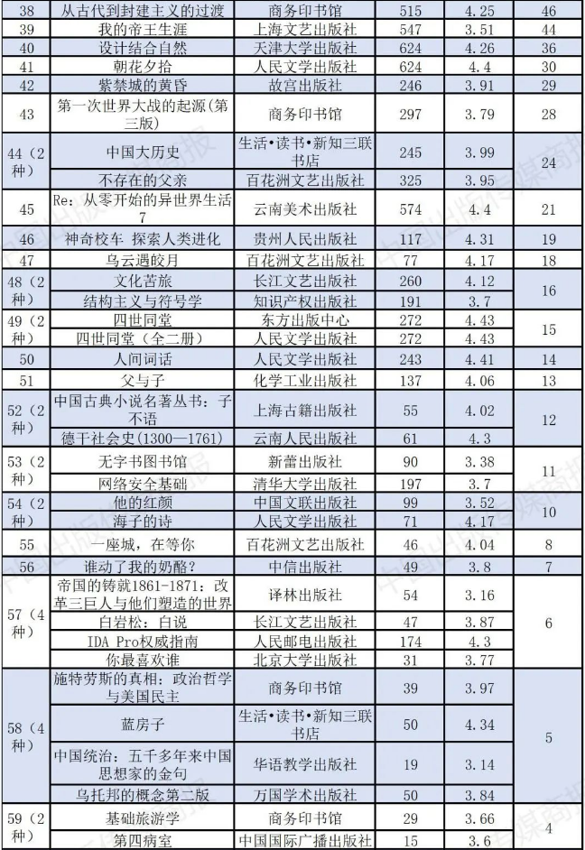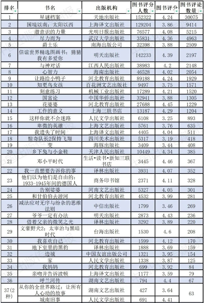 2024年上榜图书共10种,比上年度增加2种。通过表4可见,上榜的10种书中,主要为文艺类出版机构出版的文学作品。其中,人民文学出版社和新星出版社各有2种上榜,并列第一。上海文艺出版社、浙江文艺出版社、青岛出版社、译林出版社、湖南文艺出版社、南海出版公司,分别有1种上榜。