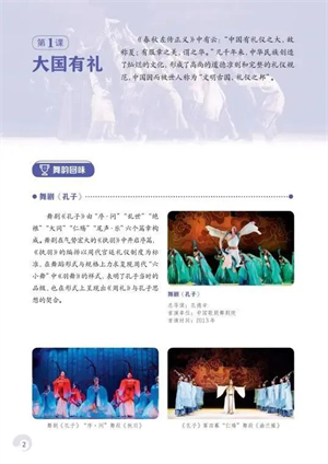 比如,八年级上册选入展现中国“文明古国、礼仪之邦”的形象的舞剧《孔子》; 八年级下册选入在新中国成立后创作的第一部中国革命题材的芭蕾舞剧《红色娘子军》,等等。
