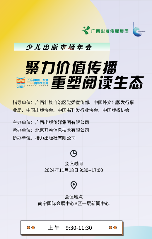 为探析童书市场趋势前沿,深度挖掘行业潜力,在2024中国—东盟图书文化周期间,广西出版传媒集团携手北京开卷信息技术有限公司共同举办2024少儿出版市场年会。本届年会以「聚力价值传播,重塑阅读生态」为主题,秉承求实精神与专业视角,围绕行业同仁在行业关键期的实践与努力,聚集产业智慧,为大家带来有价值、有智识的精彩交流和思想的深度碰撞,探寻行之有效的解决方案。