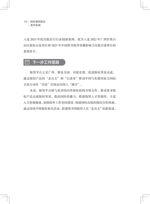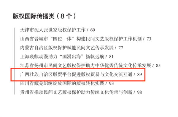 2024年4月,国家版权局组织开展了第一批版权强国建设典型案例征集工作。经评审,共遴选出24个典型案例,其中版权产业服务类8个、版权保护类8个、版权国际传播类8个。其中,由广西壮族自治区党委宣传部推荐、广西科学技术出版社承办的“中国-东盟版权贸易服务平台”入选版权国际传播类典型案例。