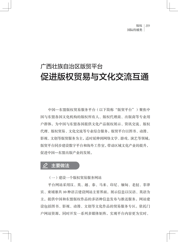 中国-东盟版权贸易服务平台(以下简称“版贸平台”)由广西科学技术出版社建设运营,于2018年8月启动,2019年8月正式上线。自启动以来,版贸平台始终致力于促进中国与东盟国家之间的版权交流与合作。版贸平台聚焦中国与东盟各国文化机构的版权所有人、版权代理商、出版商等专业用户群体,旨在为中国与东盟各国提供文化产品版权展示、资讯交流、版权代理、版权贸易、文化交流等专业综合服务。版贸平台以图书、动漫、影视、文创等文化产品的版权信息发布及贸易服务为主,目前网站实现新闻、图书信息展示、文化交流等功能,有十国语言界面,入驻网站的国内外优秀合作出版机构逾百家,总体上线图书达三千多种(含中文、英文及东盟小语种)。为创新版权贸易输出方式,广西科学技术出版社与越南芝文化股份公司、马来西亚城市书苑合作,分别成立了“中国-东盟版权贸易服务平台越南工作室”“中国-东盟版权贸易服务平台马来西亚工作室”。版贸平台海外工作室作为平台的线下站点和创新探索,积极发挥广西面向东盟的区位优势,有序推进版权合作事项,通过不断探索,形成一套高效、务实的中国-东盟文化机构版权贸易合作机制,为面向东盟国家的版权输出和引进工作提供新的助力,为中国文化产品“走出去”和东盟文化产品“引进来”提供内容和服务支撑,对促进中国与东盟国家版权贸易与文化交流具有重要意义。