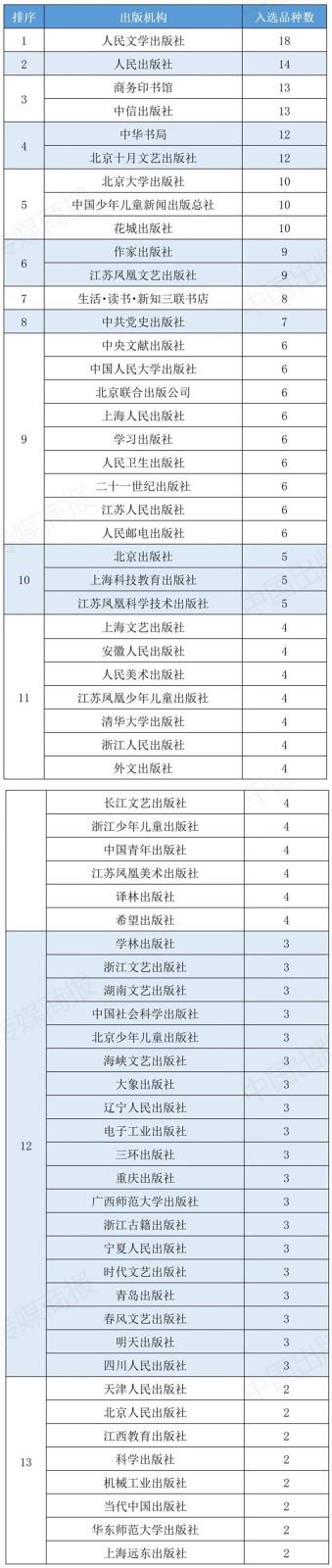 人民出版社以14种入选图书紧随其后,位列第二,且是唯一一家12届以来每届都有图书入选的出版社。商务印书馆和中信出版社各有13种入选图书,并列第三;中华书局、北京十月文艺出版社各有12种入选图书,排名第四;北京大学出版社、中国少年儿童新闻出版总社、花城出版社则以10种入选图书并列第五。