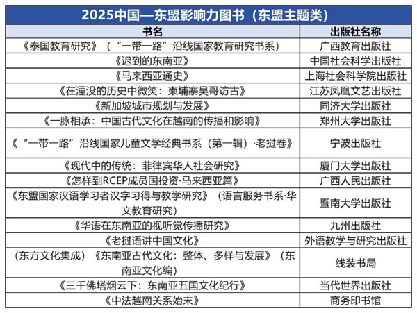 会议举行了“致敬中国—东盟影响力图书和出版机构”特别活动,发布了《2025中国—东盟图书影响力出版集团》《2025中国—东盟图书影响力出版社》《2025中国—东盟影响力图书(版权输出类)》《2025中国—东盟影响力图书(版权引进类)》《2025中国—东盟影响力图书(东盟主题类)》五个致敬名单,为这些近年来面向东盟国家在出版“走出去”“引进来”方面做出杰出贡献的出版机构和具有影响力图书的代表颁发了致敬证书。
