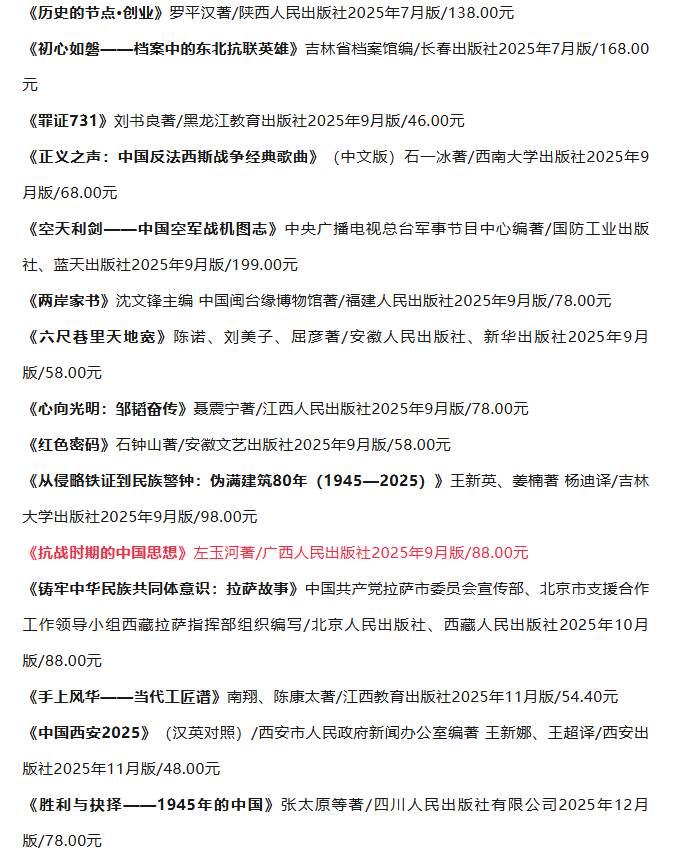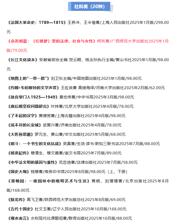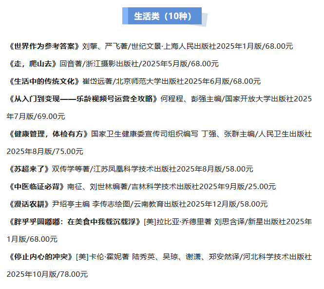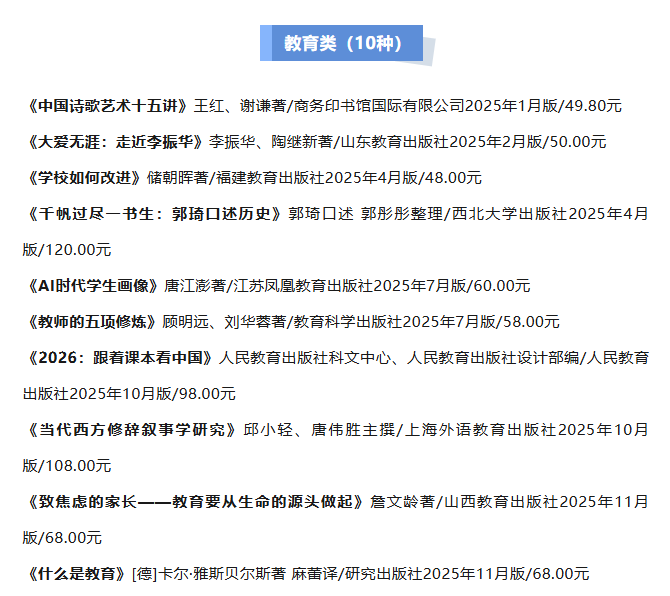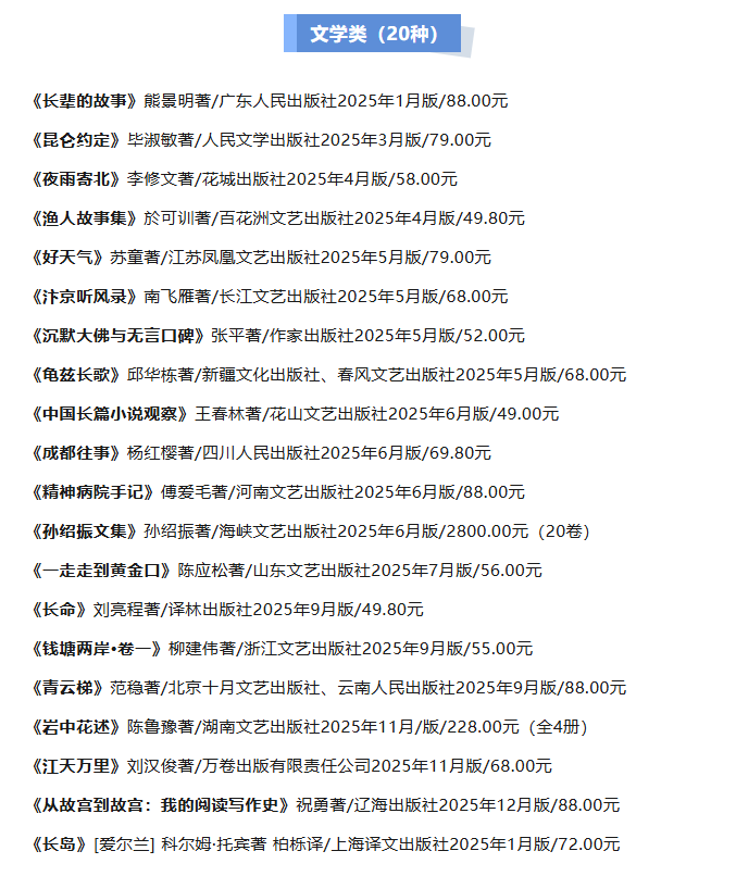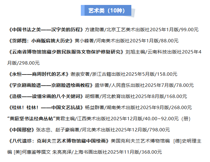 《中国出版传媒商报》2025年度影响力书单正式出炉,包含主题出版、文学、人文社科、艺术、教育、生活、