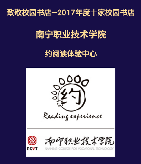 获得了全国十大“2017年度校园书店”称号,成为广西唯一获此殊荣的校园书店。通过创新的复合体验型校园书店运营合作模式,建设广西大专院校中独具特色的校园文化品牌,提升南职院校园文化形象,为建设书香校园提供更广阔的发展空间。
