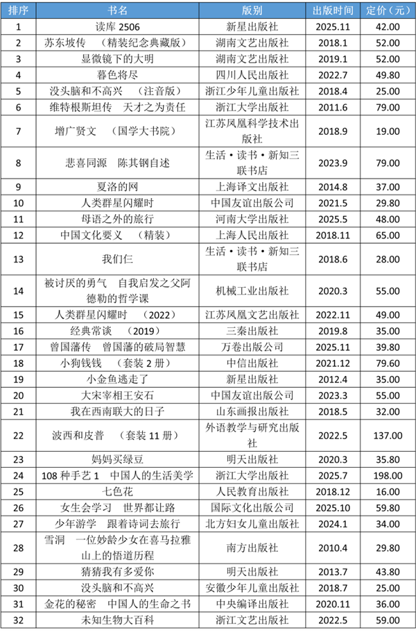 文化教育热销书同样有27个品种晋入全品类图书热销TOP100。新星出版社去年底推出的非虚构类文章集——杂志书《读库2506》,一举斩获文化教育领衔书和非主题时政领衔书双荣耀,显示了这类读物获得非同一般的市场热逐。传记读物以13个品种,独占近半壁江山,其中原创品7种。长期驻榜的《苏东坡传》(湖南文艺出版社)再次列居首位,年前出版的《曾国藩传 曾国藩的破局智慧》(万卷出版公司)、《司马懿传 一部从隐士走向权臣的成事“愤斗史”》(中国友谊出版公司),作为其中的唯二新品,联袂晋入。同为年前新书的史志读物《伊拉克访古行记》(北京大学出版社)、传统文化读物《止学今译 中国人的处世智慧》(广东经济出版社)的晋入,丰富了文教热销头部书的品类。