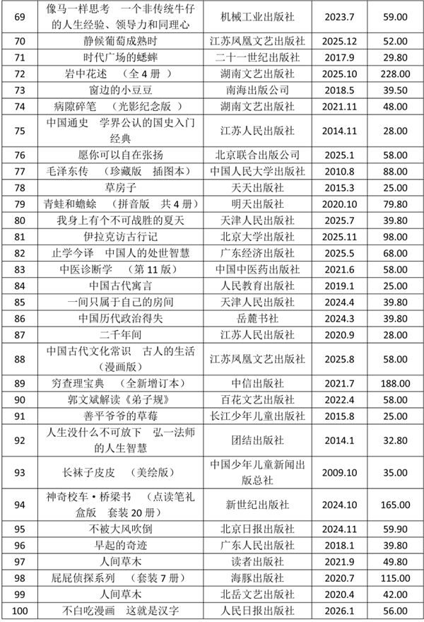 表2 2026年1月图书零售线上市场热销TOP100(按销量降序排列)