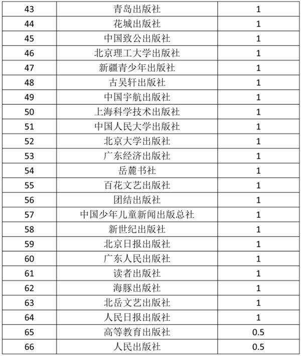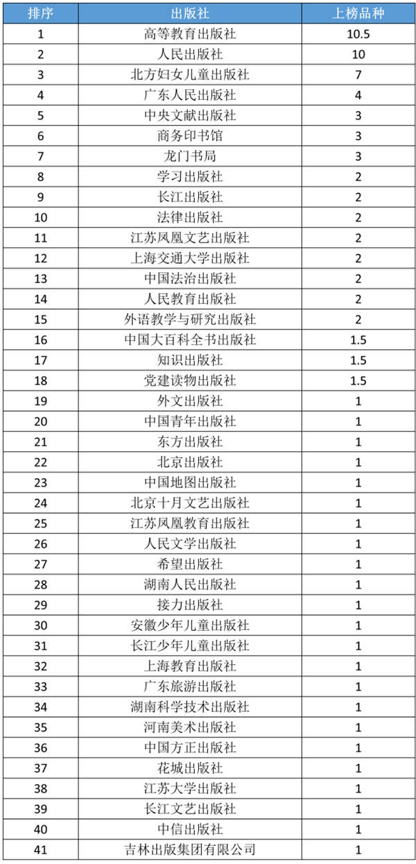 综合图书零售线下、线上市场两个热销TOP100。按出版社上榜书频次排列:高等教育出版社以11种(次)列第1位,人民出版社以10.5种(次)列第2位,江苏凤凰文艺出版社以8种(次)列第3位。
