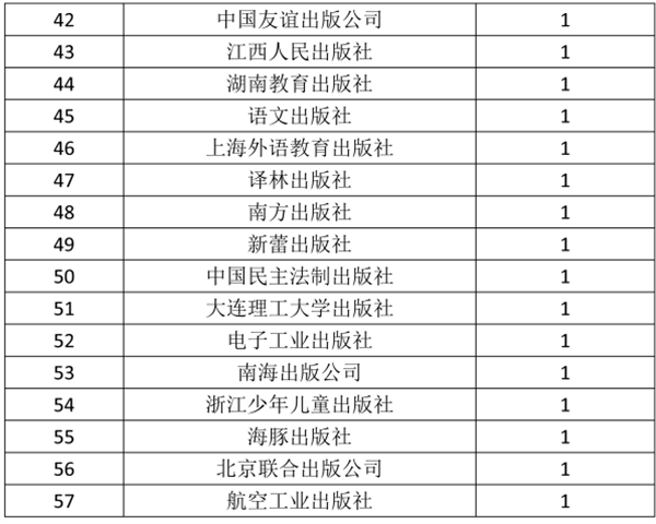 1月份,图书零售市场当年(当月)新书热销TOP50(见表5),分属37家出版社,同比增加9家。其中,中央出版社16家,地方出版社21家。北方妇女儿童出版社、岳麓书社、长江文艺出版社分别以3个品种,并列第一位;中国人民大学出版社、北京联合出版公司等7家出版社,分别以2个品种,并列第2位。新书热销指数系对新书销量、销售覆盖面、销售周期等热销权重的综合反映。