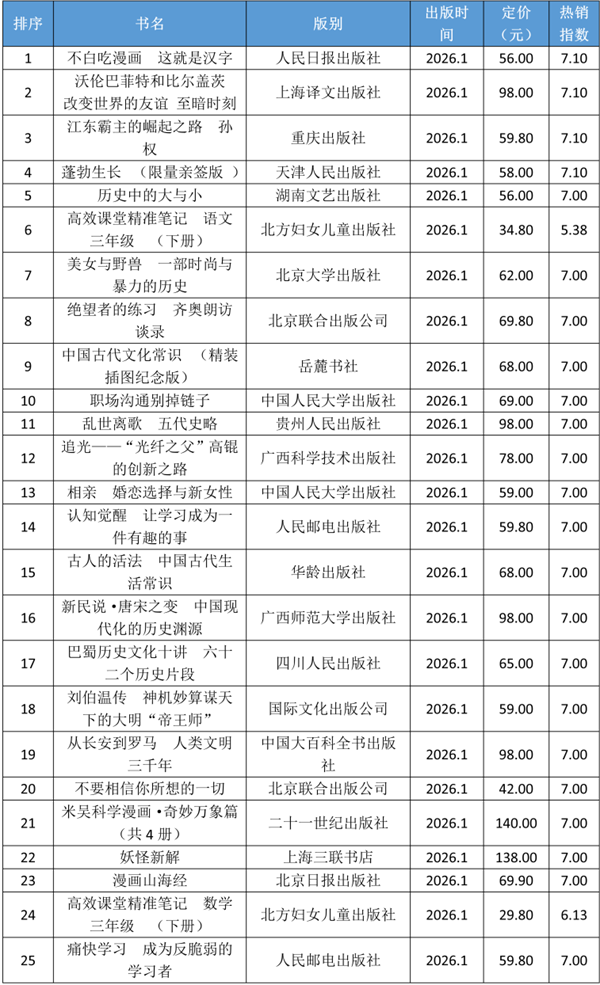 表1 2026年1月图书零售线下市场热销TOP100(按销量降序排列)