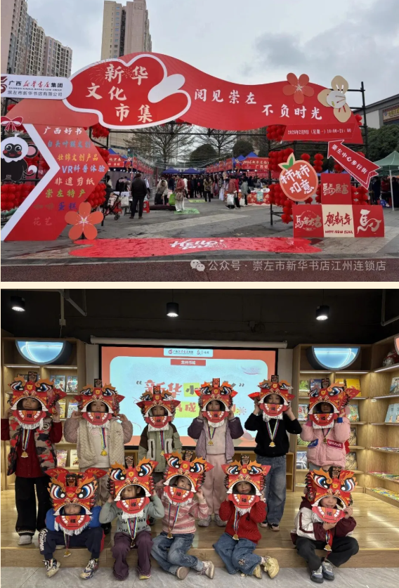 崇左市新华书店及所辖各县店多点发力,打造特色新春文化场景,各门店结合自身特色开展丰富活动:江州书城开展“马勺绘春·桂地寻宝”书课、挥春送福及新华小店长体验等活动;市店联合多单位举办新春文化市集,设置书香文创展区、非遗剪纸等环节并推出优惠;扶绥县店开展绘本共读、新华小店长、《狐狸侦探》元宵专场及促销互动活动;龙州书城创新开展融合职业培育、新春文化与非遗醒狮体验的新华小店长活动,搭配图书促销;大新县店举办剪纸、年俗竞答、新华书课及新华小店长体验活动;凭祥书城推出图书促销,友谊关国门书店吸引中外游客打卡并开展阅读活动;天等县店开展新华小店长体验、《狐狸侦探》读书会及图书促销活动,全方位营造书香年味。